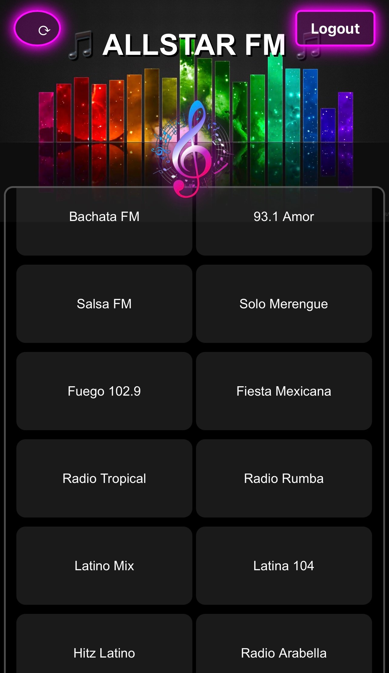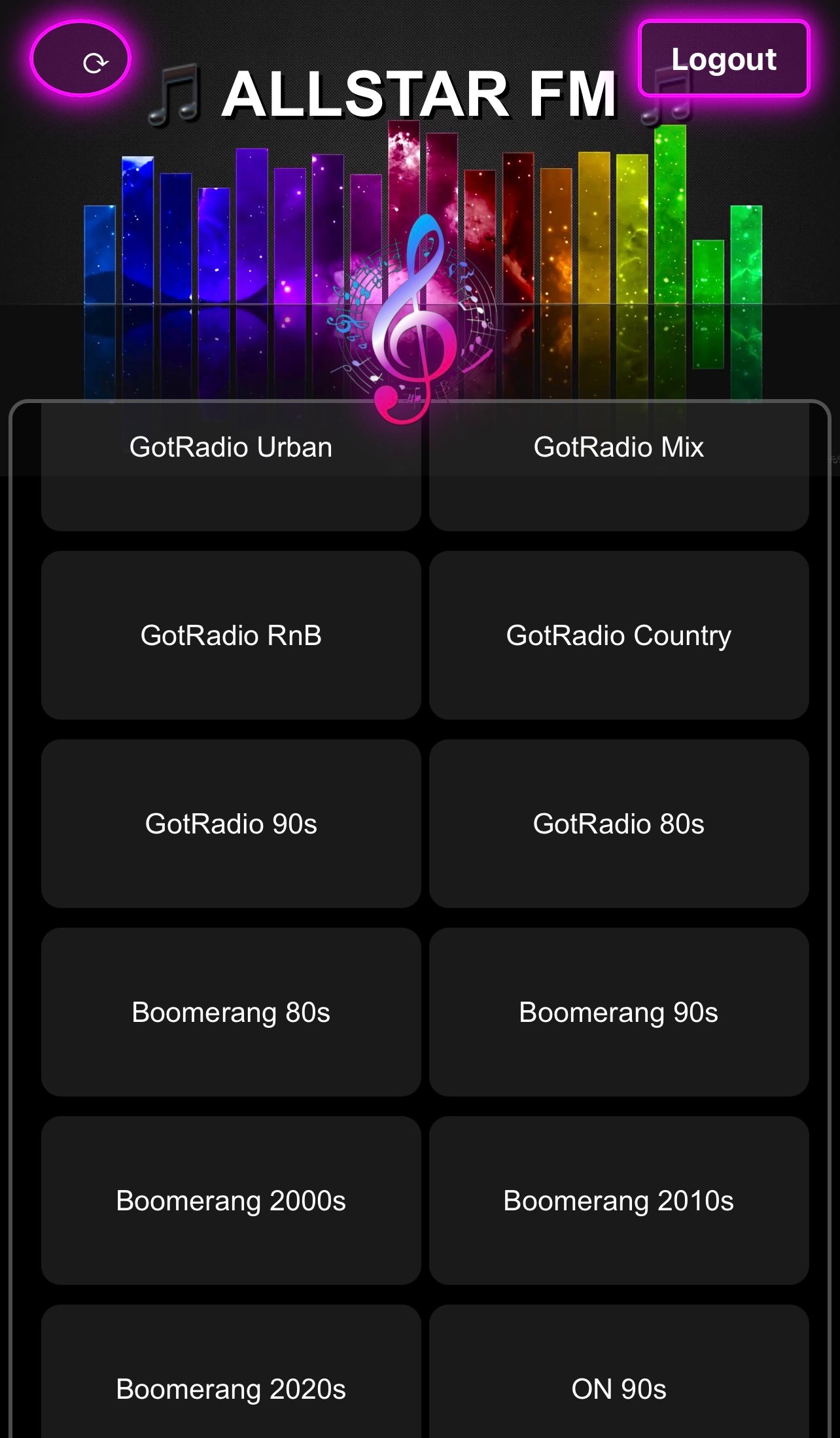 The user interface showcases a dazzling soundwave spectrum with cosmic flair, guiding you into a world of limitless musical variety. With smooth navigation across themed tiles, users can browse through dozens of curated stations — each one carefully categorized and crafted to suit a mood, moment, or memory. From Pulse EDM and Massive Dance to Bachata FM, Hip Hop Workout, and Boomerang 2000s, Allstar FM is a genre-spanning playground that caters to all tastes and backgrounds.