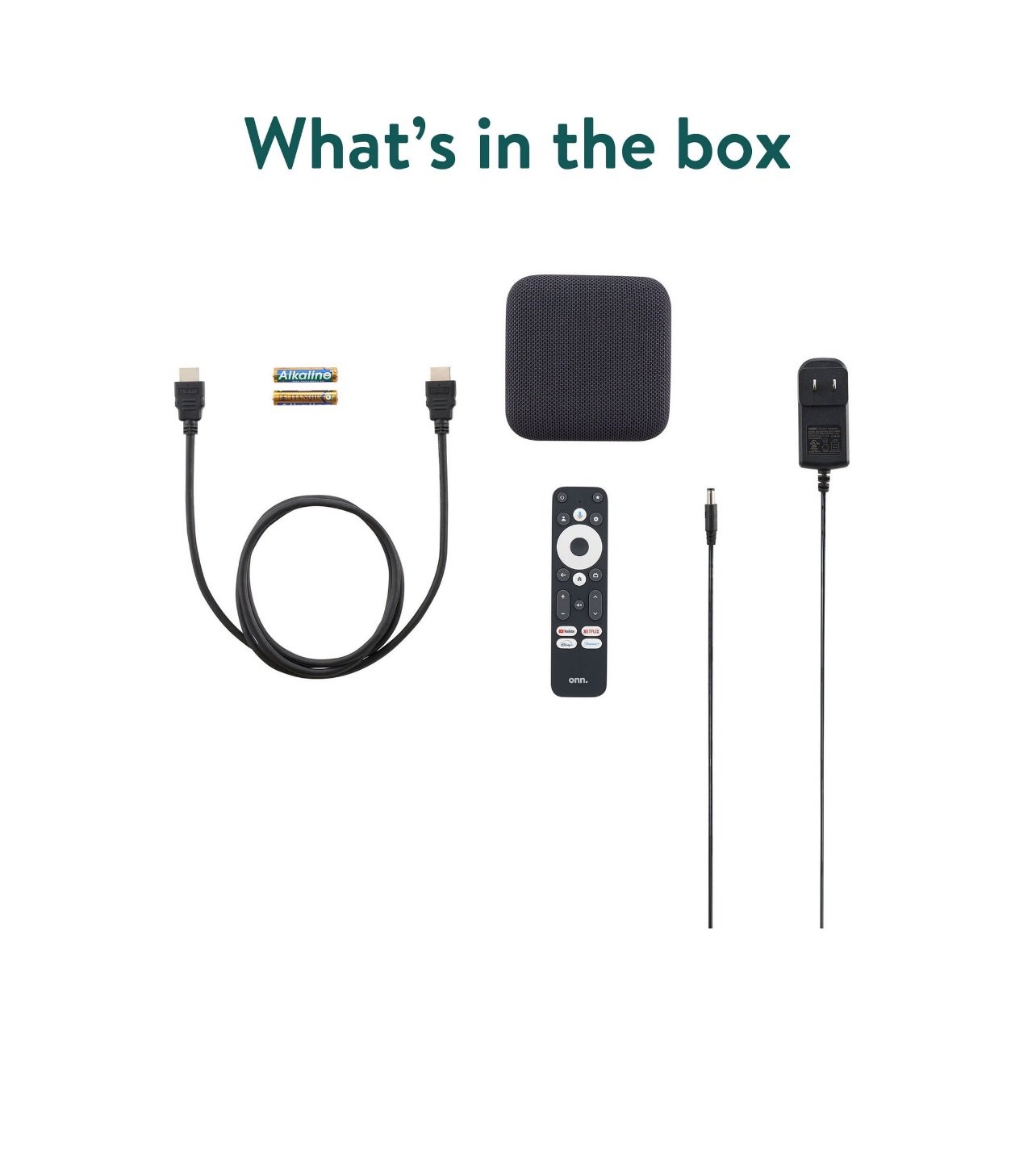 - What’s in the Box? 1 4K Pro Streaming Device, 1 Remote Control (2 AAA batteries included), 1 HDMI® cable 4.92ft (1.5 m), 1 AC Adapter with cable 4.88 ft ( 1.49 m), 1 Quick Start Guide